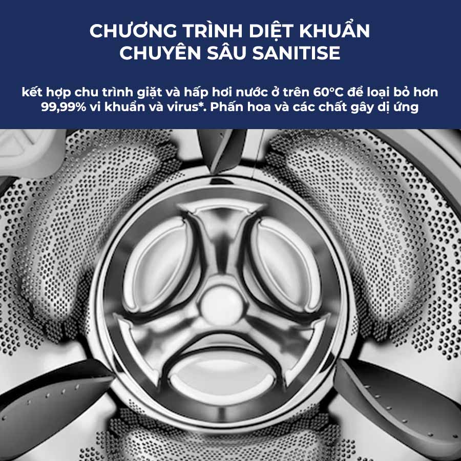 Máy giặt Electrolux inverter 9kg EWF9023P5SC được tích hợp chương trình anitise, được chứng nhận bởi Swissatest, kết hợp chu trình giặt và hấp hơi nước ở trên 60°C để loại bỏ hơn 99,99% vi khuẩn và virus. Phấn hoa và các chất gây dị ứng cũng được ghi nhận giảm, đảm bảo quần áo được vệ sinh sạch sẽ sau mỗi lần giặt.