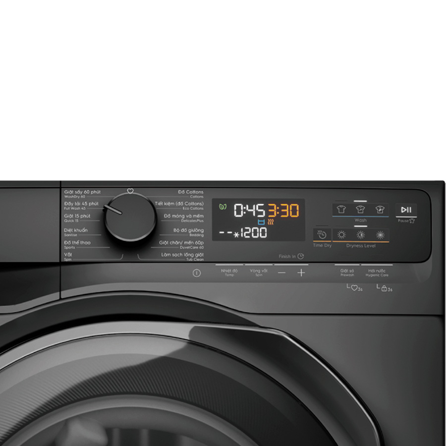 Bảng điều khiển là điểm nhấn nổi bật với sự kết hợp giữa núm xoay và cảm ứng điện tử siêu nhạy, đi kèm màn hình hiển thị sắc nét. Hơn nữa, bảng điều khiển hỗ trợ song ngữ Anh – Việt, giúp người dùng thuận tiện theo dõi và lựa chọn chương trình giặt sấy phù hợp một cách nhanh chóng và chính xác.