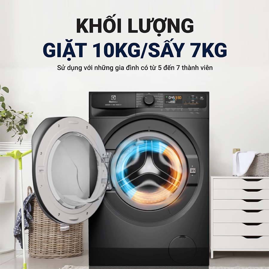Với khối lượng giặt lớn lên đến 10 kg, bạn có thể dễ dàng xử lý các mẻ quần áo cồng kềnh hoặc nhiều bộ đồ trong cùng một lần giặt, giúp tiết kiệm thời gian và công sức so với việc chia nhỏ đồ giặt nhiều lần. Khả năng sấy 7 kg tương ứng với lượng quần áo được làm khô nhanh chóng, giúp bạn chủ động hơn trong việc hoàn thành chu trình giặt sấy mà không cần lo lắng về việc phải phơi lâu, đặc biệt hữu ích trong những ngày mưa hoặc thời tiết ẩm ướt.