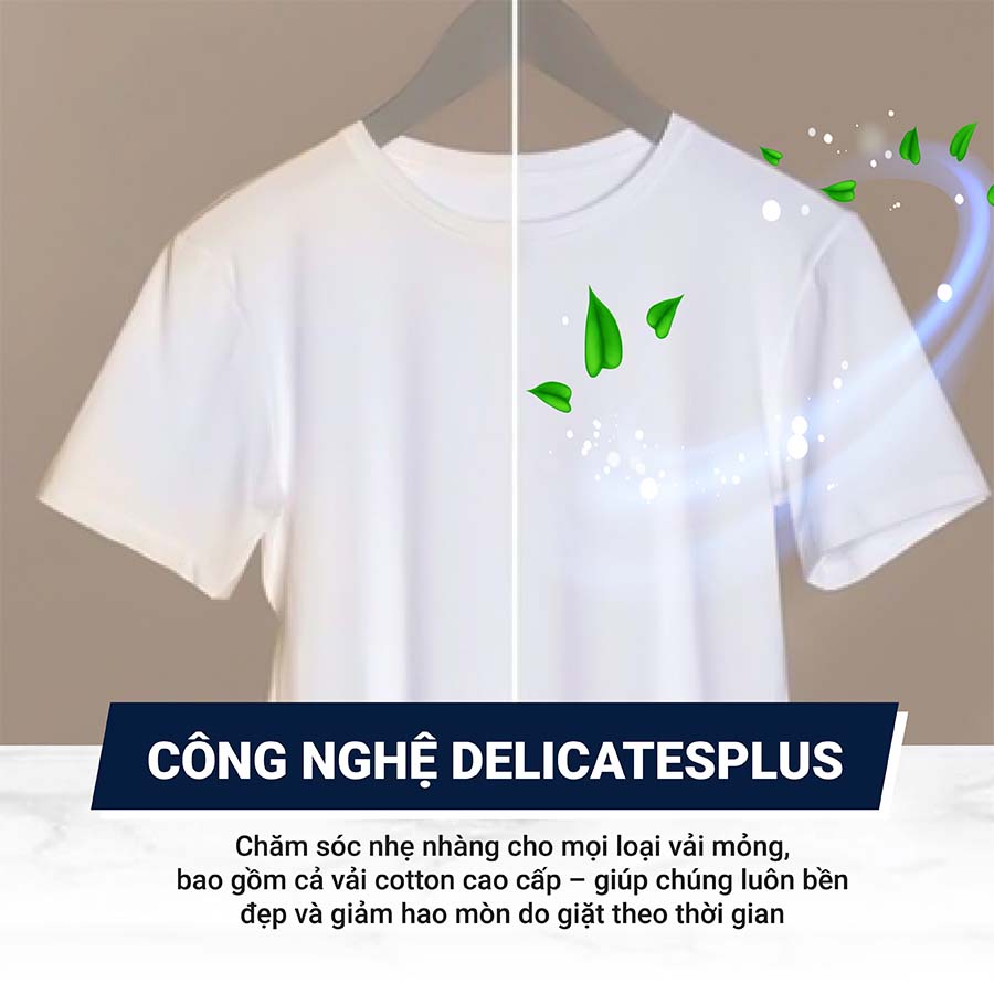 Công nghệ này sử dụng chuyển động giặt nhẹ nhàng kết hợp với mực nước được tối ưu hóa, giúp giảm ma sát và hạn chế xoắn rối sợi vải trong quá trình giặt. Nhờ đó, quần áo giữ được form dáng, màu sắc và độ mềm mại lâu hơn, giảm thiểu nguy cơ giãn, sờn hay xù lông do giặt máy.