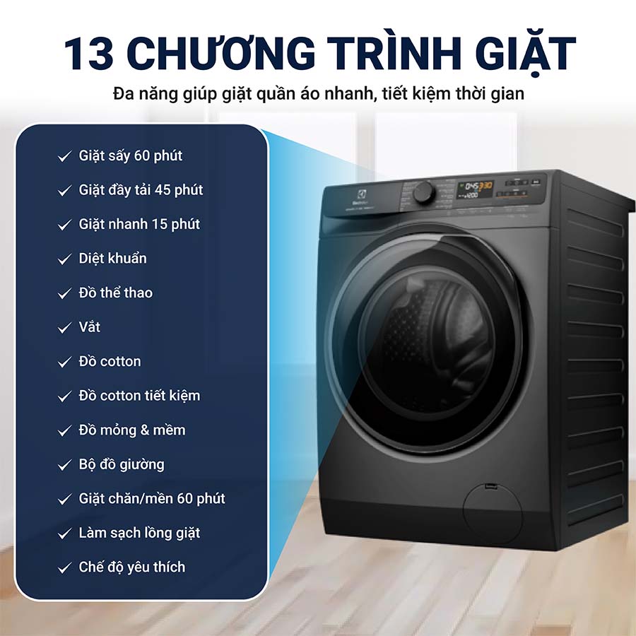 Máy giặt sấy Electrolux được trang bị 13 chương trình giặt đa dạng, đáp ứng nhiều nhu cầu giặt giũ khác nhau của người dùng.