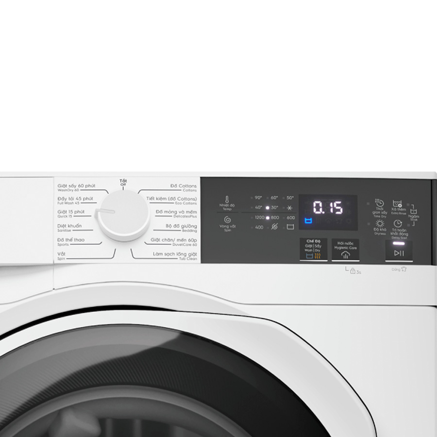 Máy được trang bị bảng điều khiển kết hợp giữa núm xoay cơ học và bảng cảm ứng nhạy bén, cho phép người dùng lựa chọn chương trình giặt/sấy một cách nhanh chóng, chính xác. Toàn bộ hệ thống điều khiển được thể hiện bằng song ngữ Anh – Việt, phù hợp với mọi đối tượng sử dụng, từ người trẻ đến người lớn tuổi. Màn hình LED hiển thị rõ ràng giúp bạn dễ dàng theo dõi trạng thái hoạt động, thời gian còn lại hay nhiệt độ giặt/sấy trong suốt quá trình vận hành.