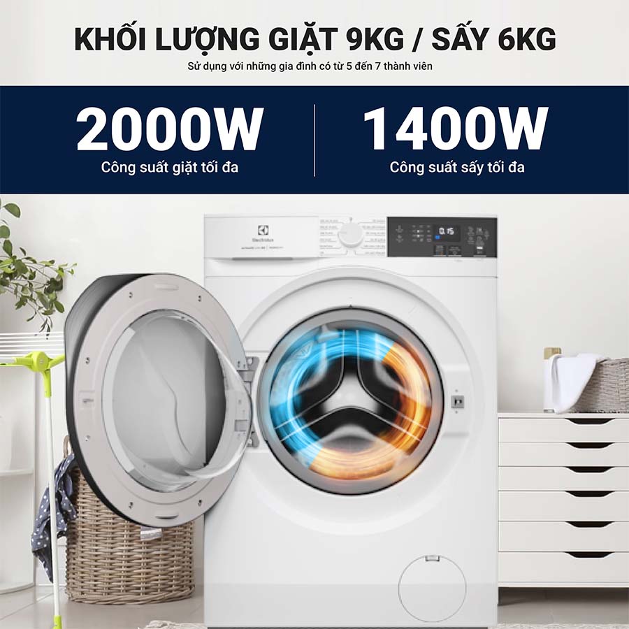 Với công suất giặt 9 kg, sấy 6 kg, model này đáp ứng tốt nhu cầu giặt sấy hàng ngày của các gia đình từ 3 đến 5 thành viên. Ngay cả với những gia đình ít người nhưng có nhu cầu giặt đồ thường xuyên, máy cũng mang lại hiệu quả cao, giúp bạn luôn duy trì nguồn quần áo sạch sẽ và khô ráo.