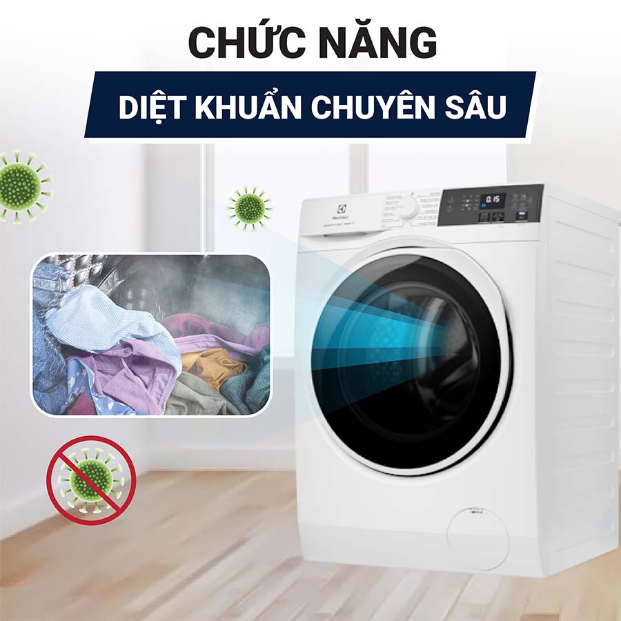 Máy giặt sấy Electrolux EWW9024P3WC được trang bị chương trình Sanitise chuyên sâu, đã được chứng nhận bởi tổ chức Swissatest uy tín. Chương trình này kết hợp giữa chu trình giặt kỹ lưỡng và công nghệ hấp hơi nước ở nhiệt độ trên 60 độ C, tạo ra môi trường lý tưởng để tiêu diệt hơn 99,99% vi khuẩn và virus bám trên quần áo.