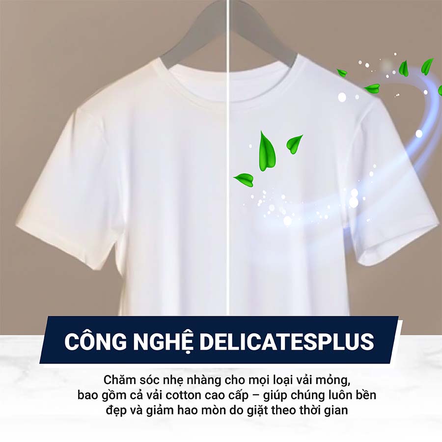 Nhờ chuyển động giặt nhẹ nhàng kết hợp với mức nước sử dụng phù hợp, DelicatesPlus giảm thiểu ma sát và tác động mạnh lên sợi vải trong suốt quá trình giặt. Điều này giúp bảo vệ hiệu quả các loại vải mỏng, đặc biệt là vải cotton cao cấp, giữ cho quần áo luôn bền đẹp và hạn chế hao mòn theo thời gian sử dụng. Nhờ vậy, bạn có thể yên tâm giặt những trang phục tinh tế và dễ hư hỏng mà không lo làm giảm tuổi thọ hay làm mất đi vẻ đẹp ban đầu của chúng.