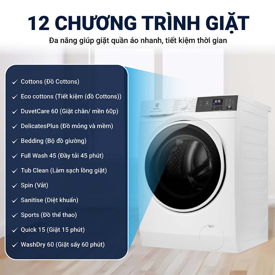 Nhằm đáp ứng nhu cầu giặt giũ đa dạng của người dùng, máy giặt sấy Electrolux EWW9024P3WC3 được trang bị lên đến 12 chương trình. Từ giặt đồ cotton, đồ thể thao, đồ mỏng mềm, đồ hỗn hợp… hay giặt nhanh, mỗi chương trình đều được thiết kế tối ưu để phù hợp với từng loại vải và mức độ bẩn cụ thể. Nhờ sự linh hoạt này, người dùng có thể dễ dàng lựa chọn chế độ phù hợp mà không cần lo lắng về việc quần áo bị hư hỏng do giặt không đúng cách. Điều này không chỉ giúp làm sạch hiệu quả mà còn góp phần bảo vệ sợi vải, duy trì độ bền và màu sắc quần áo lâu dài.