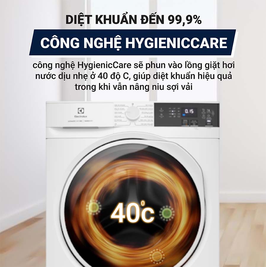 Công nghệ giặt hơi nước Hygienic Care hiện đại, mang đến khả năng làm sạch quần áo hiệu quả hơn nhờ sử dụng hơi nước tinh khiết. Công nghệ này không chỉ giúp loại bỏ các vết bẩn cứng đầu mà còn tiêu diệt đến 99,9% vi khuẩn, đồng thời loại bỏ các tác nhân gây dị ứng phổ biến như lông thú, mạt bụi, phấn hoa và các vi khuẩn gây hại khác.