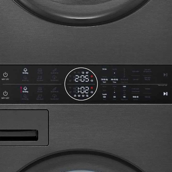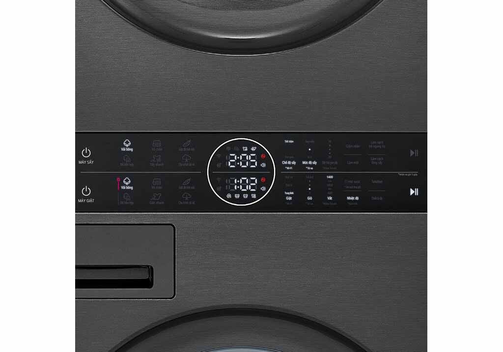 Máy được tích hợp 2 tính năng giặt và sấy với chung một bảng điều khiển đặt ở giữa. Nhờ vậy người dùng có thể thao tác với máy vô cùng thuận tiện. Thiết kế này được người dùng đánh giá cao bởi bảng điều khiển được đặt ngang tầm. Bạn sẽ không cần phải với lên để điều chỉnh máy sấy ở phía trên.