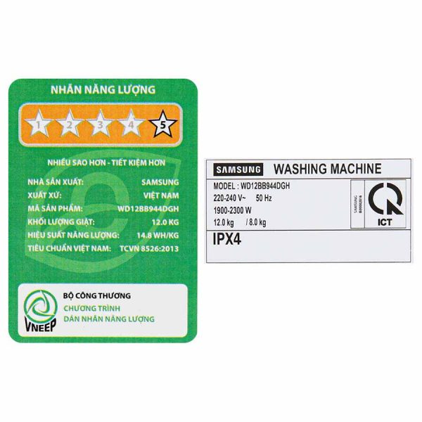 - Khối lượng giặt: Giặt 12 Kg – Sấy 8 Kg