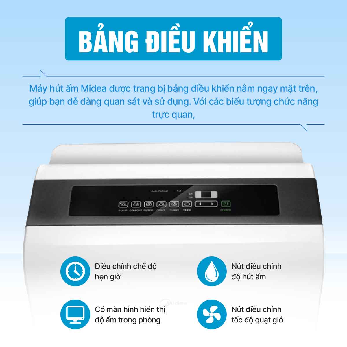 Máy hút ẩm Midea được trang bị bảng điều khiển nằm ngay mặt trên, giúp bạn dễ dàng quan sát và sử dụng. Với các biểu tượng chức năng trực quan, bạn có thể nhanh chóng lựa chọn các chế độ theo ý muốn, bao gồm: Chế độ hẹn giờ, chế độ hút ẩm, tốc độ gió. Màn hình hiển thị độ ẩm tương đối trong phòng, giúp bạn theo dõi và điều chỉnh độ ẩm một cách chính xác.