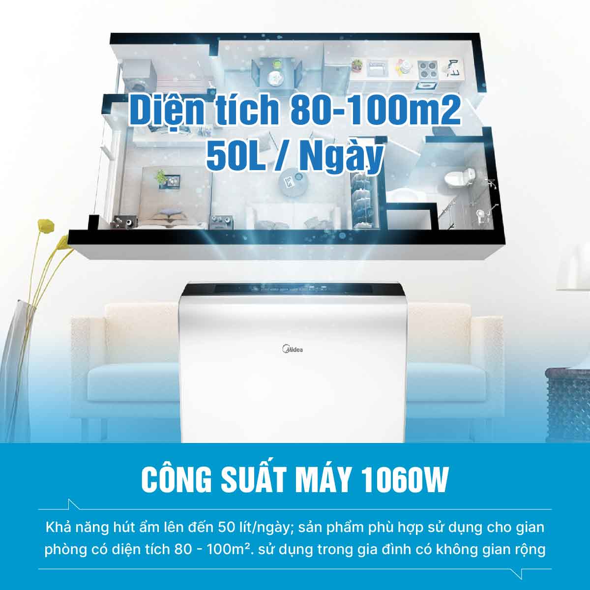 Với công suất 1060W, khả năng hút ẩm lên đến 50 lít/ngày; sản phẩm phù hợp sử dụng cho gian phòng có diện tích 80 – 100m² . Midea MDDP-50DEN7-QA3-B được lựa chọn sử dụng trong gia đình có không gian rộng, văn phòng, quán ăn… Máy giúp làm khô thoáng sàn nhà, hong khô quần áo nhanh chóng và bảo vệ các vật dụng nội thất, đồ gia dụng, thiết bị điện tử khỏi nguy cơ ẩm mốc.