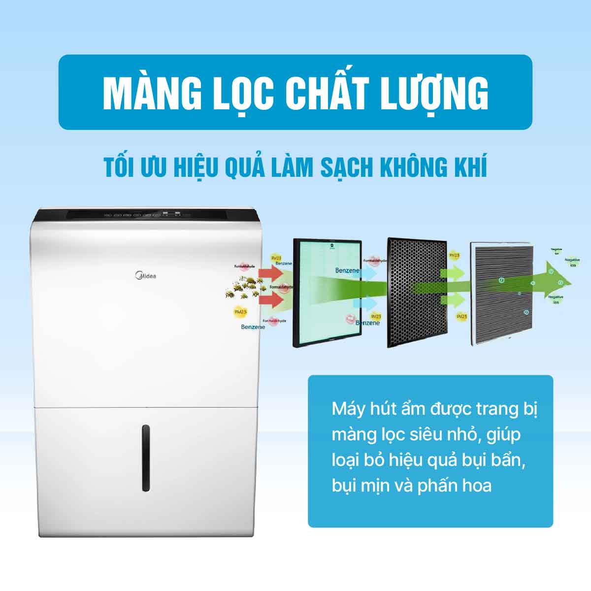 Máy hút ẩm Midea MDDP-50DEN7-QA3-B được trang bị màng lọc siêu nhỏ, giúp loại bỏ hiệu quả bụi bẩn, bụi mịn và phấn hoa, mang lại bầu không khí trong lành, bảo vệ sức khỏe của bạn và gia đình. Không chỉ giúp không gian sống trở nên thoáng sạch, dễ chịu mà lưới lọc này còn ngăn bụi bẩn tích tụ bên trong thiết bị, duy trì hiệu suất hút ẩm ổn định và gia tăng độ bền cho máy.