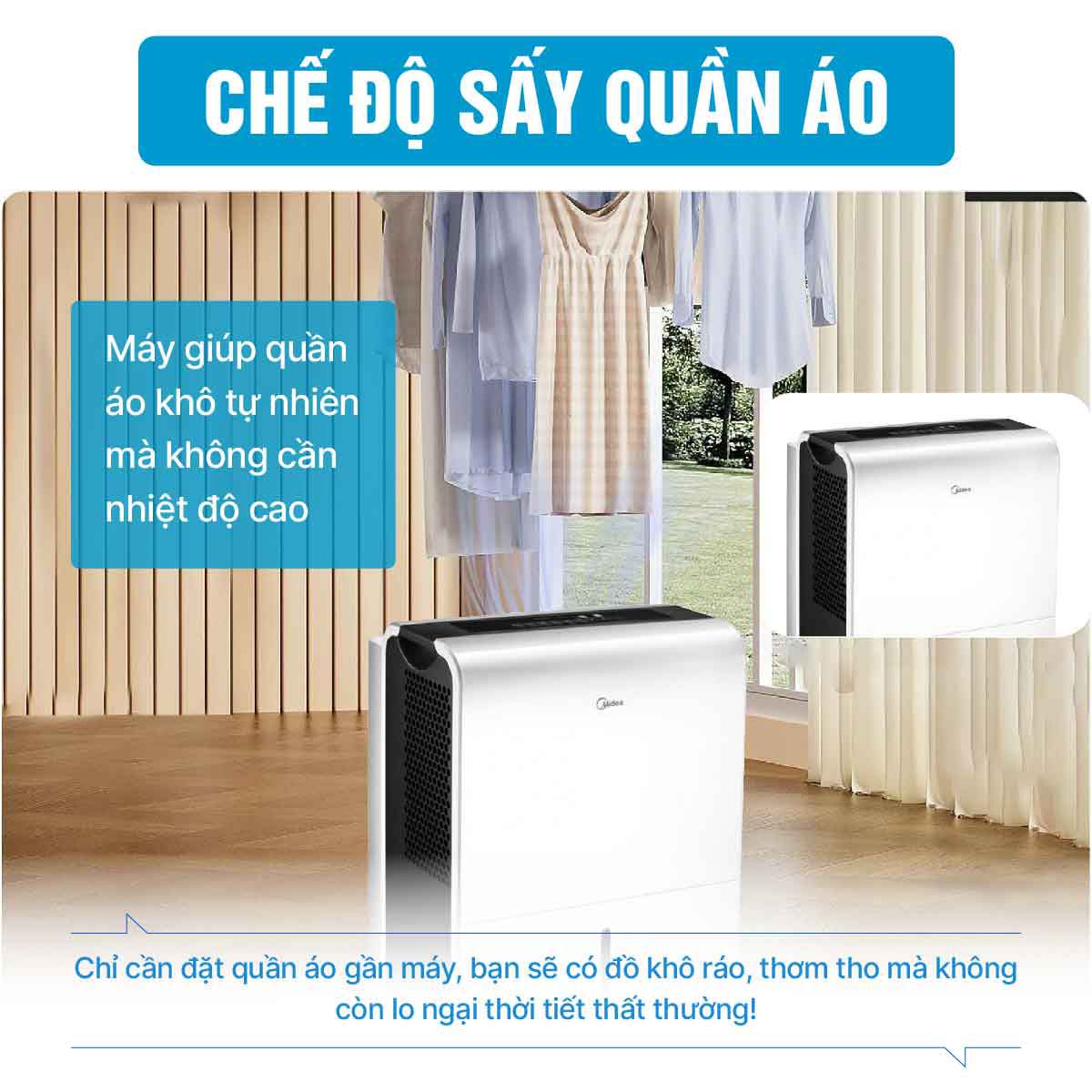 Chế độ sấy nhanh quần áo trên máy hút ẩm Midea là giải pháp hoàn hảo cho những ngày mưa nồm ẩm ướt. Với khả năng hút ẩm nhanh chóng và tạo luồng không khí khô thoáng, máy giúp quần áo khô tự nhiên mà không cần nhiệt độ cao, bảo vệ tối ưu cho chất liệu vải. Chỉ cần đặt quần áo gần máy, bạn sẽ có đồ khô ráo, thơm tho mà không còn lo ngại thời tiết thất thường!