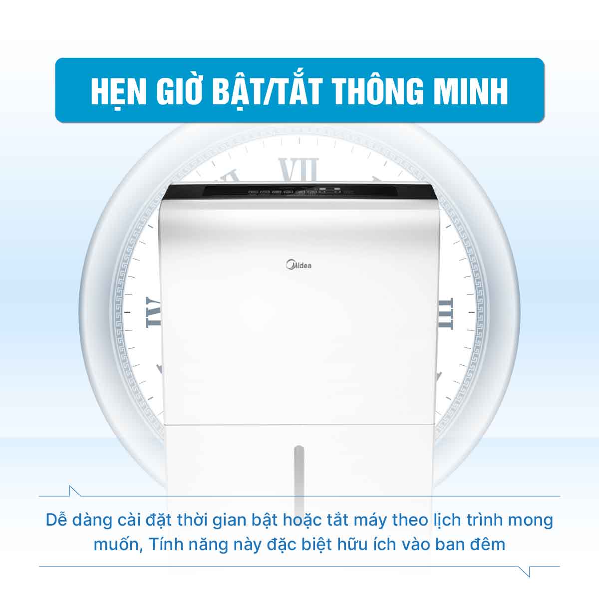 Bạn có thể dễ dàng cài đặt thời gian bật hoặc tắt máy theo lịch trình mong muốn, giúp máy tự động hoạt động khi cần thiết mà không phải canh chỉnh thủ công. Tính năng này đặc biệt hữu ích vào ban đêm hoặc khi bạn vắng nhà, đảm bảo không gian luôn khô thoáng mà vẫn tiết kiệm điện năng.