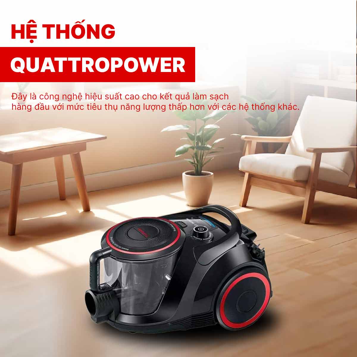 Máy hút bụi BGS41POW1 được trang bị hệ thống QuattroPower, đây là công nghệ hiệu suất cao cho kết quả làm sạch hàng đầu với mức tiêu thụ năng lượng thấp hơn với các hệ thống khác. Sự kết hợp độc đáo giữa động cơ tốc độ cao, vòi phun hiệu suất cao, gioăng khí được tối ưu hóa và hộp đựng bụi lớn. Với thiết kế đặc biệt này, giúp cung cấp lực hút mạnh mẽ, hoạt động hiệu quả trên nhiều loại bề mặt như sàn cứng, thảm… đảm bảo rằng quá trình hút bụi diễn ra nhanh chóng, làm sạch đáng kinh ngạc.