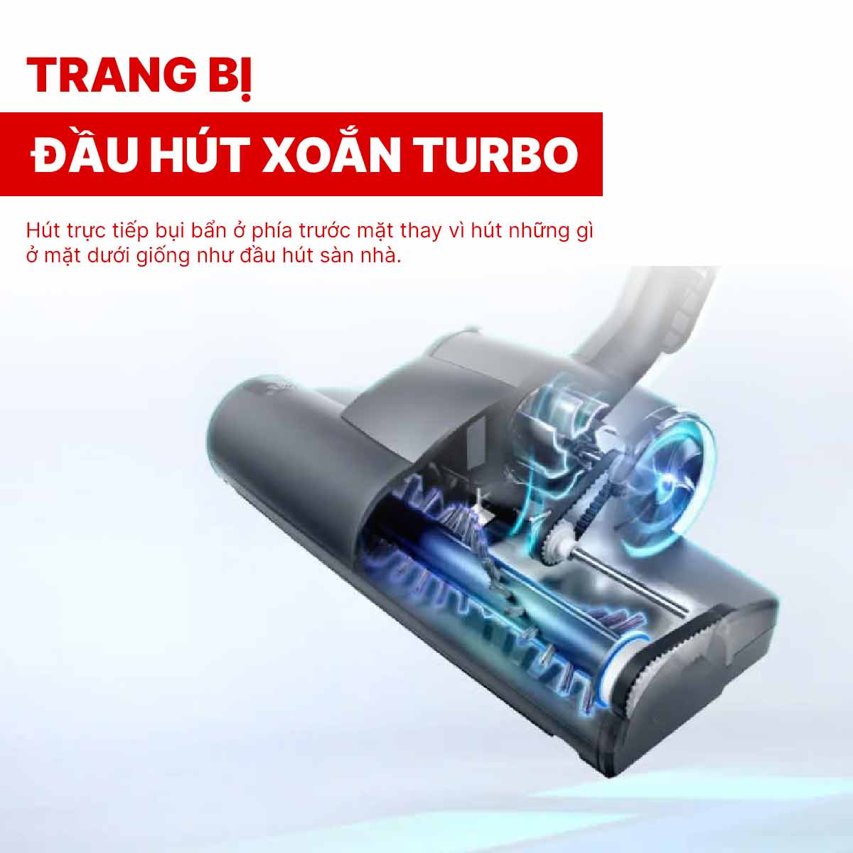 Khi máy hút bụi hoạt động, bàn chải xoắn sẽ quay với tốc độ cao từ đó máy có thể tiếp cận và loại bỏ bụi bẩn cứng đầu, gỡ rối các loại lông thú cưng, tóc nằm sâu trong các sợi thảm hoặc trên các bề mặt mềm khác, những nơi mà đầu hút thông thường khó có thể làm sạch hiệu quả. Mặc dù hiệu quả nhất trên thảm, đầu hút xoắn Turbo cũng có thể được sử dụng trên sàn cứng, các khe hở khó tiếp cận để loại bỏ các loại bụi bẩn cứng đầu mà đầu hút thông thường có thể bỏ sót.
