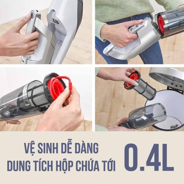 Không chỉ giúp tiết kiệm không gian lưu trữ, chức năng tự đứng vững còn giúp máy luôn trong trạng thái sẵn sàng hoạt động. Bạn có thể đặt máy ở bất kỳ đâu trong nhà mà không cần giá đỡ chuyên dụng. Khi cần sử dụng, chỉ cần cầm lên và bắt đầu vệ sinh ngay lập tức mà không mất thời gian tìm kiếm.
