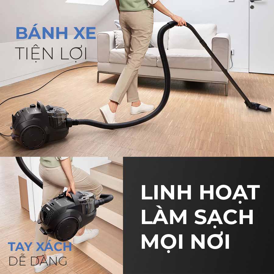 Ngoài bánh xe linh hoạt, máy hút bụi còn tích hợp tay xách chắc chắn ngay trên thân máy, giúp người dùng dễ dàng cầm nắm và di chuyển máy đến nhiều vị trí khác nhau trong nhà, đặc biệt là khi cần mang máy lên xuống cầu thang. Điều này giúp giảm bớt sự nặng nhọc khi dọn dẹp, tăng tính tiện lợi trong quá trình sử dụng.
