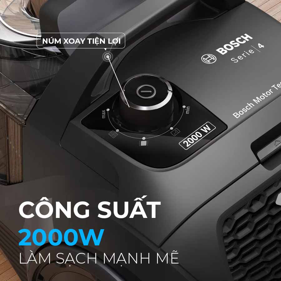 Máy hút bụi Bosch sở hữu động cơ công suất lên đến 2000W, mang đến hiệu quả làm sạch nhanh chóng và triệt để trên nhiều loại bề mặt như sàn gỗ, gạch men, thảm hay các khe hẹp khó tiếp cận. Công suất hút mạnh mẽ giúp loại bỏ bụi bẩn, lông thú cưng và các hạt nhỏ li ti một cách hiệu quả chỉ trong một lần hút, tiết kiệm tối đa thời gian dọn dẹp.