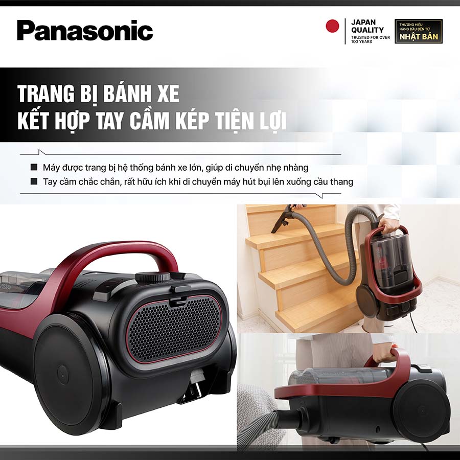 Điểm đặc biệt của Panasonic MC-CL607RN49 là thiết kế tay cầm kép, giúp người dùng dễ dàng nâng hoặc di chuyển máy khi cần hút bụi ở các khu vực cao hơn. Ví dụ, khi cần làm sạch bụi trên bậc cầu thang hoặc các vị trí có độ cao khác nhau, người dùng có thể cầm chắc tay cầm và di chuyển máy một cách an toàn, không gây cản trở trong quá trình sử dụng.