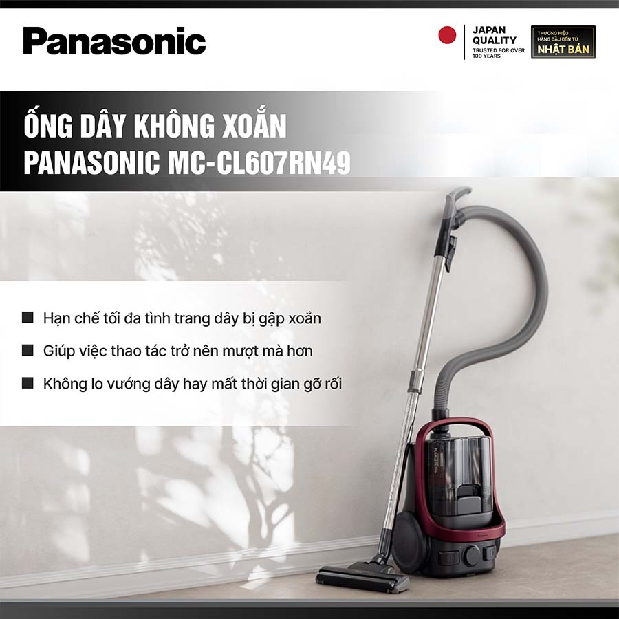 Một trong những cải tiến đáng chú ý của Panasonic MC-CL607RN49 là ống dây không xoắn, giúp người dùng dễ dàng thao tác mà không lo bị rối dây hay vướng víu trong lúc hút bụi. Điều này không chỉ giúp tiết kiệm thời gian mà còn đảm bảo quá trình dọn dẹp diễn ra liên tục, không bị gián đoạn.