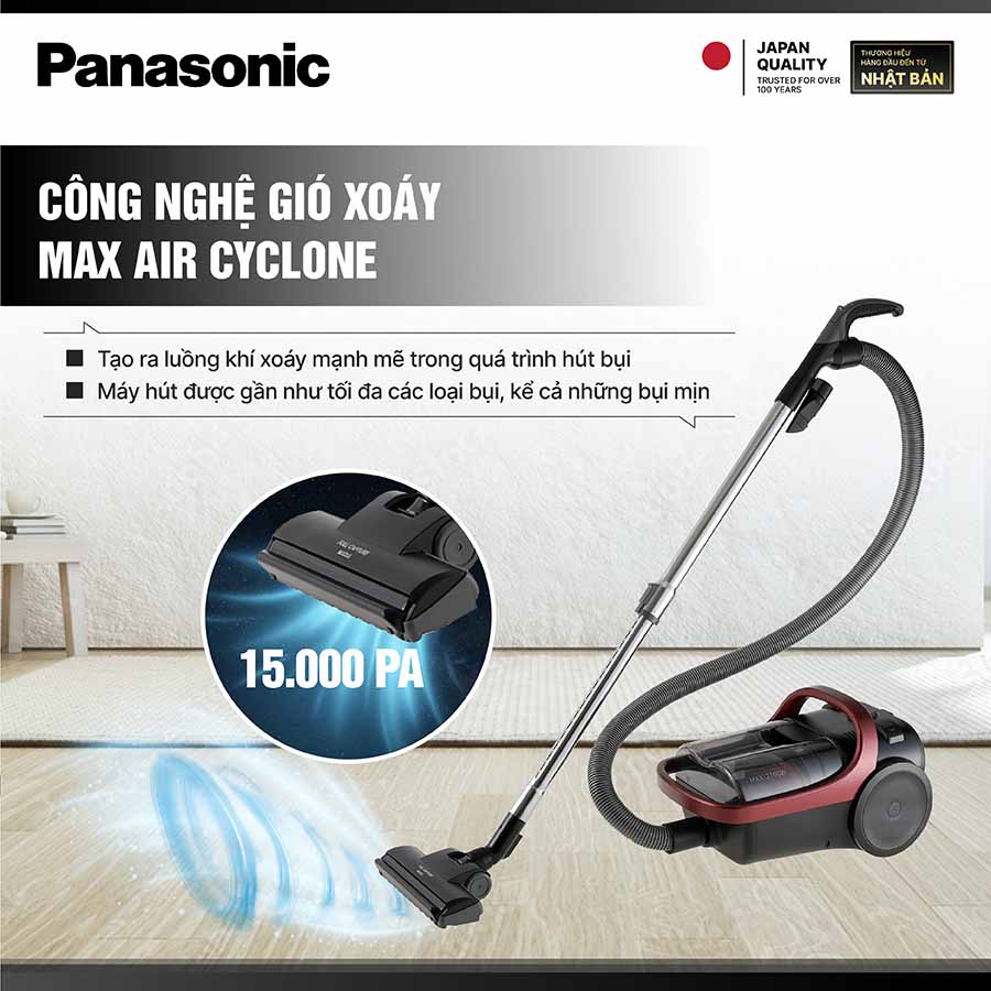 Panasonic MC-CL607RN49 sở hữu công suất hoạt động lên đến 2100W, mang lại hiệu suất làm sạch vượt trội. Nhờ công suất mạnh mẽ này, máy tạo ra lực hút lên đến 15000 Pa, giúp nhanh chóng loại bỏ bụi bẩn, lông thú cưng, vụn thức ăn và các mảnh vụn nhỏ trên sàn nhà, thảm hoặc các bề mặt khác.