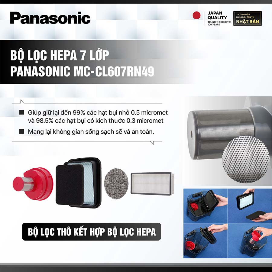 Máy hút bụi Panasonic MC-CL607RN49 được trang bị bộ lọc xả HEPA 7 lớp, giúp giữ lại đến 99% các hạt bụi nhỏ có kích thước 0.5 micromet và 98.5% các hạt bụi có kích thước 0.3 micromet. Nhờ đó, máy có khả năng loại bỏ hầu hết các tác nhân gây dị ứng như bụi mịn, phấn hoa, lông thú cưng và các vi khuẩn có hại trong không khí, mang lại không gian sống sạch sẽ và an toàn cho cả gia đình.
