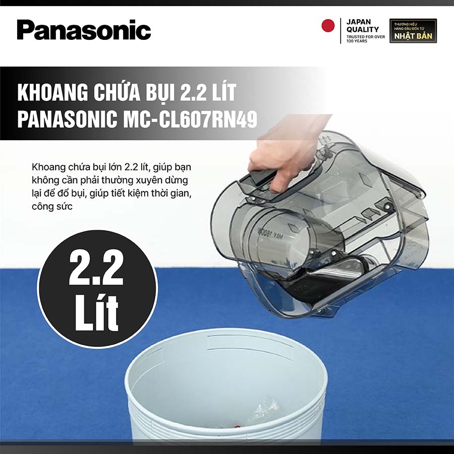 Với dung tích khoang chứa bụi lên đến 2.2 lít, Panasonic MC-CL607RN49 giúp bạn hút bụi liên tục trong thời gian dài mà không cần đổ bụi nhiều lần. Hộp chứa bụi thiết kế lớn, dễ dàng tháo rời để đổ bụi và vệ sinh, giúp việc sử dụng máy trở nên tiện lợi hơn.