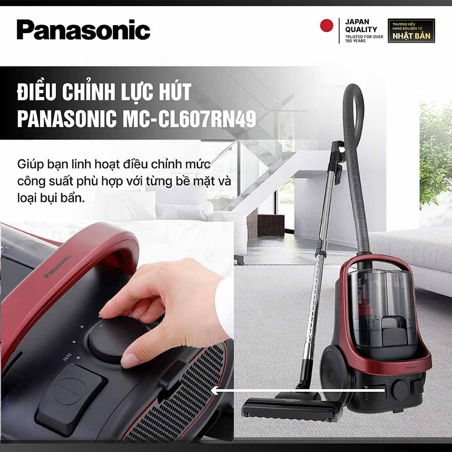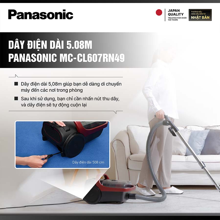 Máy hút bụi Panasonic MC-CL607RN49 không chỉ nổi bật với thiết kế tiện dụng, công suất mạnh mẽ, bộ lọc hiện đại mà còn được trang bị nhiều đầu hút chuyên biệt cùng các tính năng thông minh như điều chỉnh lực hút và tự động thu dây điện. Với những ưu điểm này, sản phẩm đáp ứng tốt nhu cầu làm sạch nhà cửa, mang lại không gian sống trong lành, tiện nghi cho người dùng.
