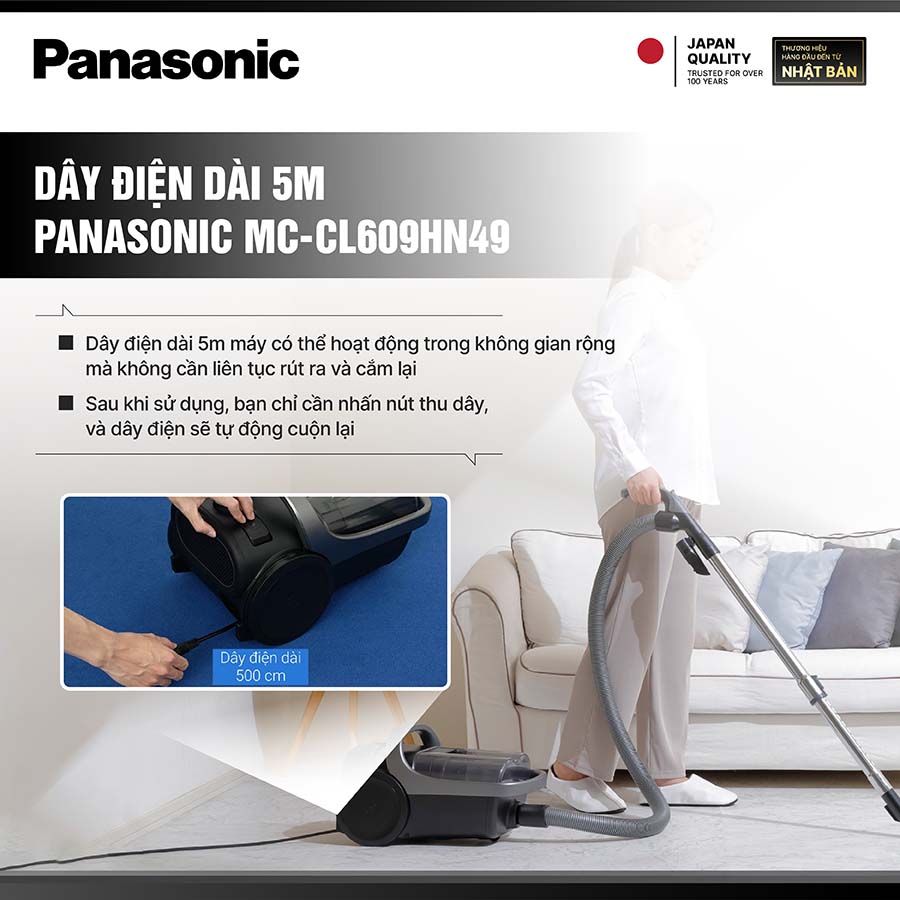 Một điểm cộng lớn khác của Panasonic MC-CL609HN49 là hệ thống tự thu gọn dây điện chỉ với một thao tác nhấn nút. Điều này giúp máy trông gọn gàng hơn khi không sử dụng, tránh tình trạng dây điện bị vướng víu trong quá trình cất giữ. Người dùng cũng không cần mất thời gian cuộn dây bằng tay như một số dòng máy hút bụi truyền thống.
