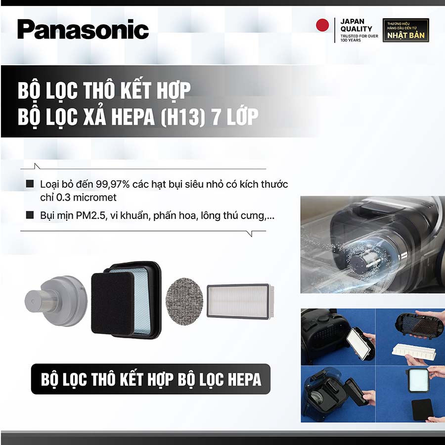 Hệ thống bộ lọc HEPA 7 lớp, có khả năng loại bỏ đến 99,97% các hạt bụi siêu nhỏ có kích thước chỉ 0.3 micromet, bao gồm bụi mịn PM2.5, vi khuẩn, phấn hoa, lông thú cưng, khói thuốc, thức ăn và hạn chế nấm mốc phát triển. Chính vì vậy, bộ lọc xả HEPA đóng vai trò quan trọng trong việc đảm bảo luồng không khí thải ra sạch sẽ, không mang theo bụi mịn hay vi khuẩn quay trở lại không gian sống. Điều này giúp giảm nguy cơ dị ứng, bảo vệ hệ hô hấp và mang lại không gian sống trong lành hơn. Nhờ đó, Panasonic MC-CL609HN49 không chỉ là một thiết bị hút bụi mạnh mẽ mà còn góp phần bảo vệ sức khỏe gia đình, đặc biệt phù hợp với những người bị dị ứng hoặc có vấn đề về hô hấp.