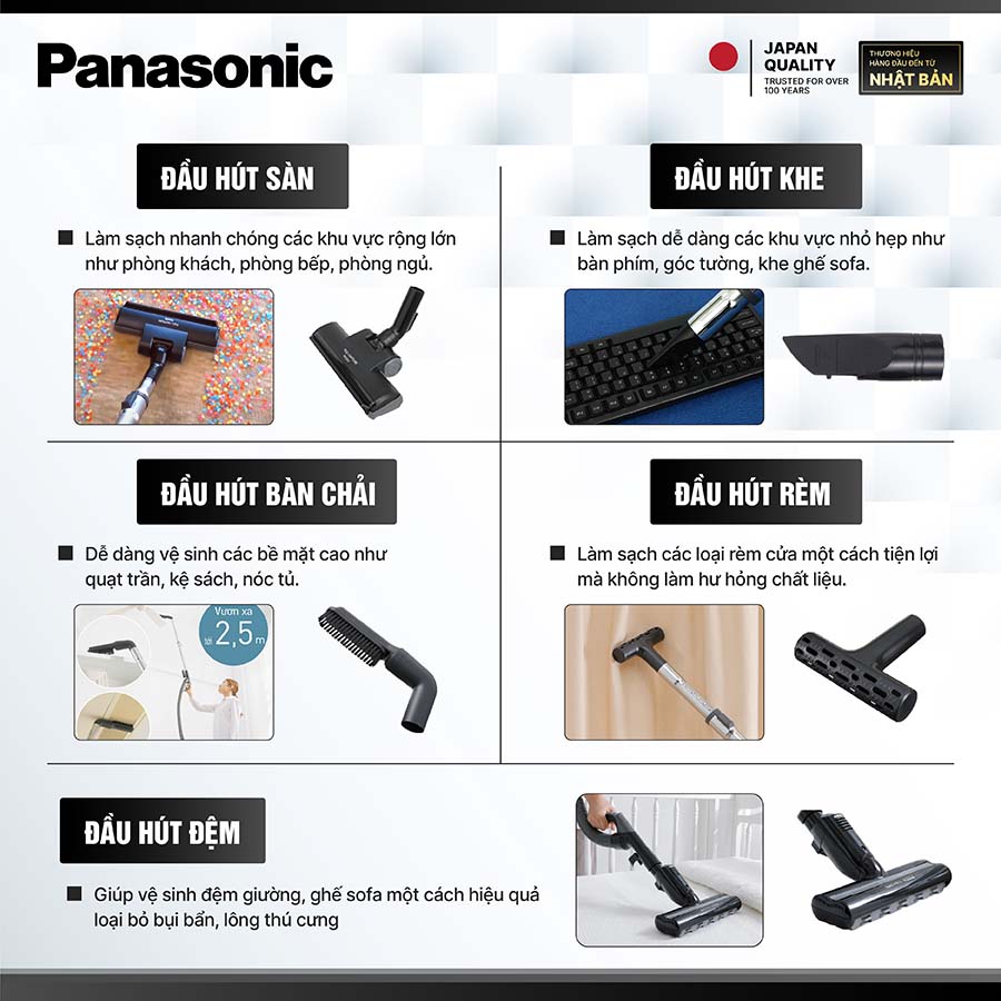 Với bộ phụ kiện đầu hút đa dạng này, máy hút bụi Panasonic MC-CL609HN49 mang đến khả năng làm sạch linh hoạt, đáp ứng đầy đủ nhu cầu vệ sinh trong gia đình.