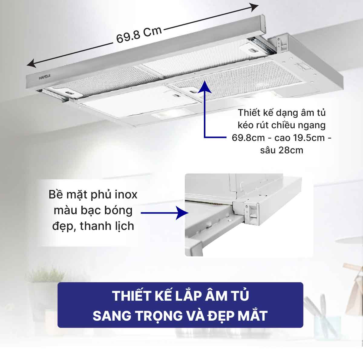 Máy hút mùi âm tủ bề mặt phủ inox màu bạc bóng đẹp, thanh lịch, phù hợp để lắp đặt vào tủ bếp có sẵn