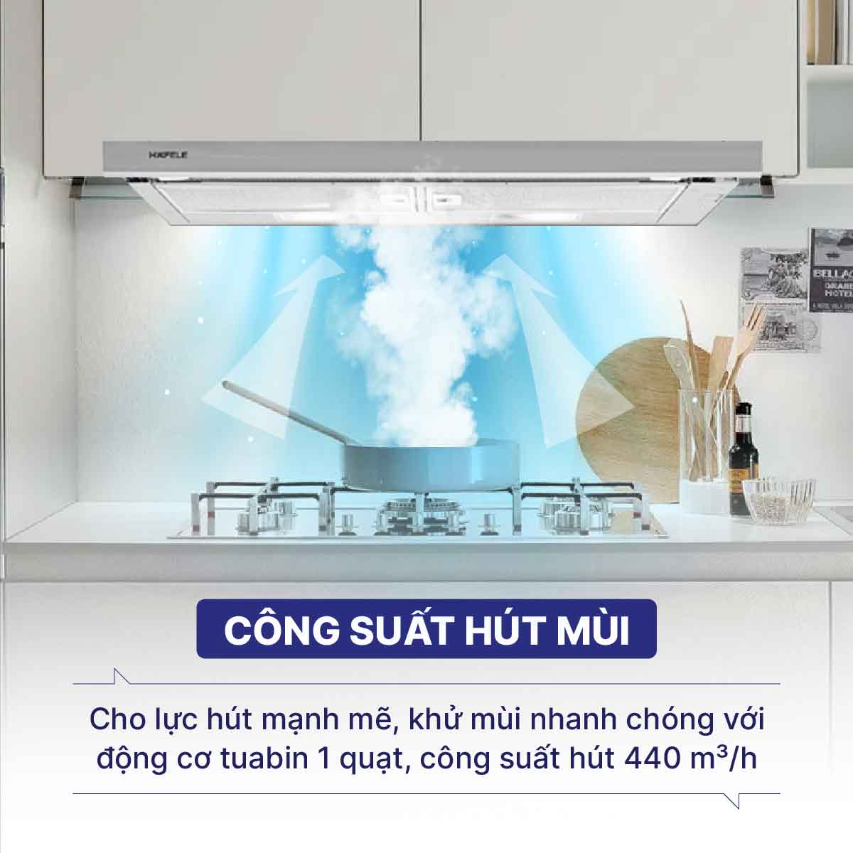 Cho lực hút mạnh mẽ, khử mùi nhanh chóng với động cơ tuabin 1 quạt, công suất hút 440 m³/h