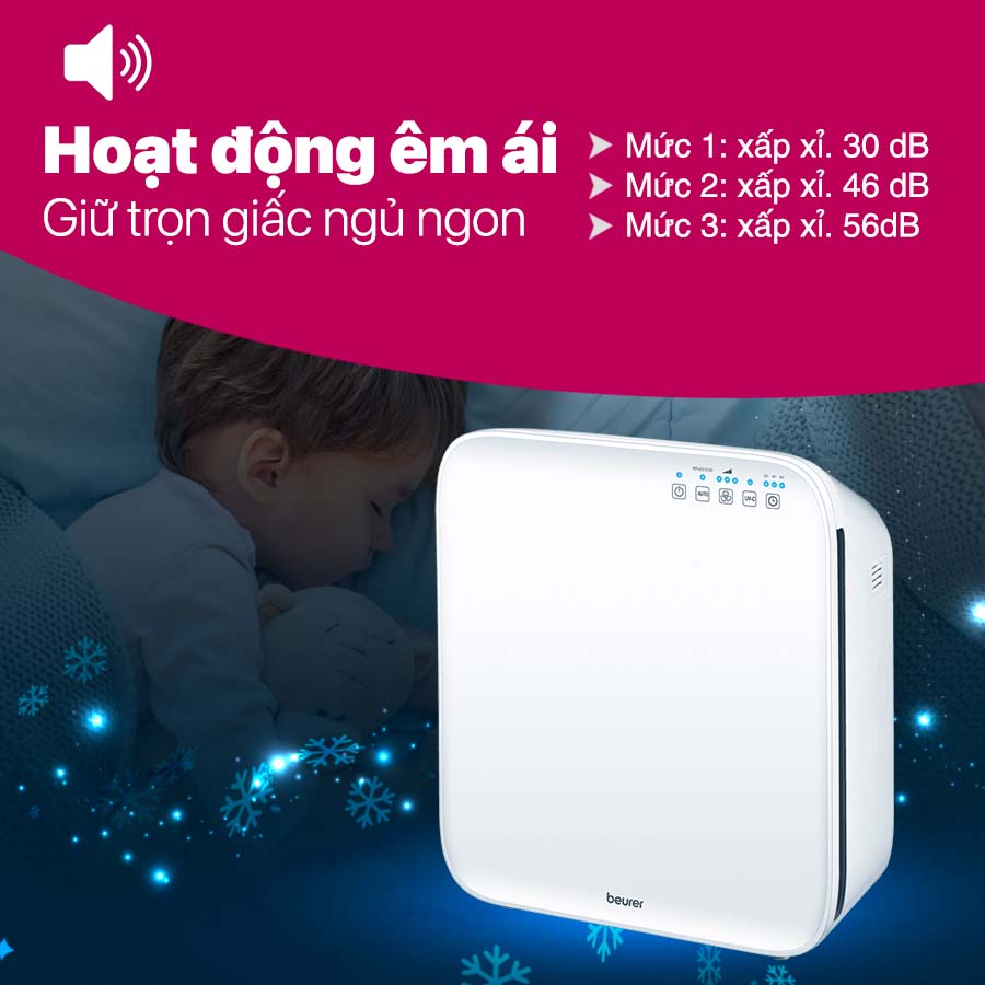 Máy lọc không khí Beurer LR310 được trang bị hệ thống lọc ba lớp hiệu quả gồm tấm lọc thô, tấm lọc than hoạt tính và màng lọc EPA E12, mang đến khả năng loại bỏ đến 99,5% các tác nhân gây hại trong không khí như virus, vi khuẩn, nấm mốc, bụi mịn hay phấn hoa. Nhờ cấu trúc lọc thông minh này, thiết bị giúp làm sạch không khí nhanh chóng, tạo ra môi trường sống an toàn, trong lành hơn cho mọi thành viên trong gia đình – đặc biệt là trẻ nhỏ, người lớn tuổi và những ai dễ bị dị ứng đường hô hấp.