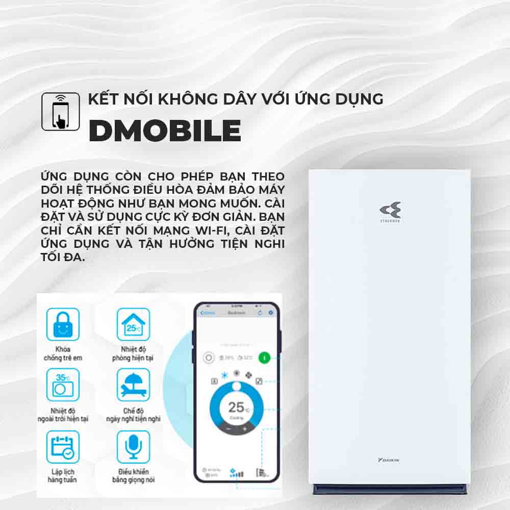 Daikin MC80ZVM7 cho phép người dùng kết nối không dây với máy lọc không khí thông qua ứng dụng DMobile. Điều này mang lại sự thuận tiện lớn khi người dùng có thể quản lý và điều chỉnh máy lọc không khí từ xa, ngay cả khi họ không ở nhà.