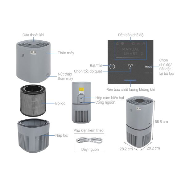 • Bộ lọc bụi cho máy: Đèn UV diệt khuẩn, Màng lọc HEPA13, Lọc kháng khuẩn, Màng lọc than hoạt tính, Màng lọc thô