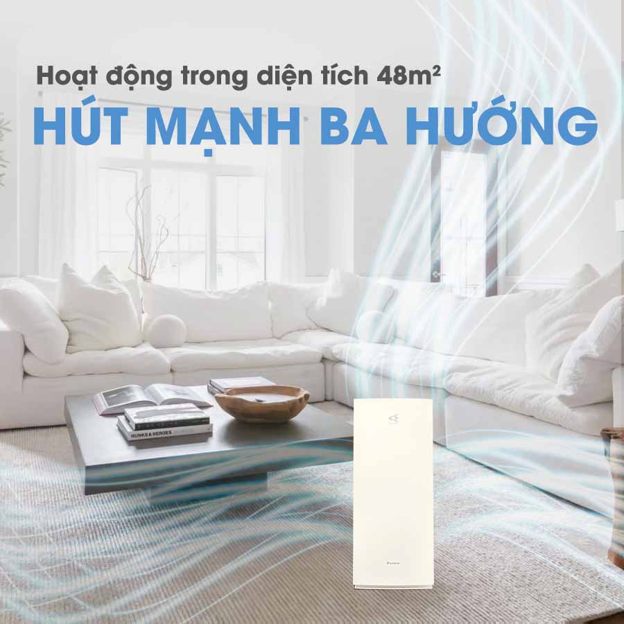 • Hút gió mạnh mẽ từ 3 hướng cho phép hút vào một lượng lớn không khí, từ đó nhanh chóng làm sạch không khí trong phòng, gia tăng hiệu suất lọc khí. Ngoài ra, máy lọc không khí này với thiết kế 3 hướng hút, cho phép máy có thể đặt sát tường mà vẫn đảm bảo hiệu suất lọc khí.