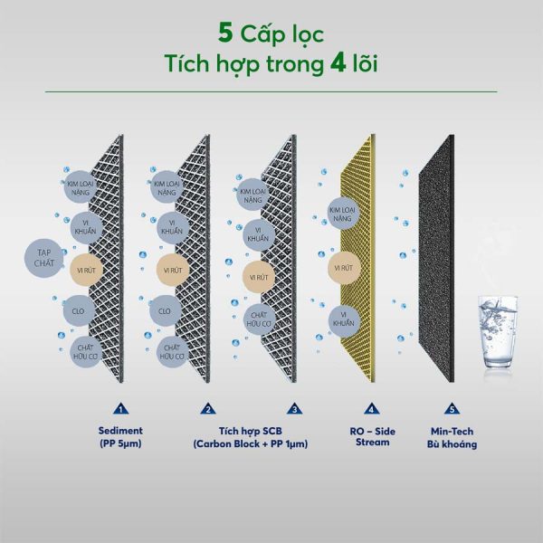 - Lõi RO – Side Stream – Đây là lõi lọc quan trọng với công nghệ RO – Side Stream độc quyền, giúp loại bỏ hoàn toàn kim loại nặng như chì, thủy ngân, asen, và vi khuẩn gây hại. Ngoài ra, lõi này còn giúp nâng cao hiệu suất lọc, tiết kiệm nước và kéo dài tuổi thọ của máy.