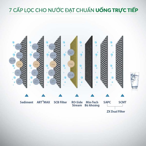 Nhờ đó, nước sau lọc không chỉ sạch về mặt vi sinh mà còn giữ được vị tươi mới, dễ uống như nước suối tự nhiên. Không dừng lại ở việc khử mùi, lõi GAC Min-Tech còn thực hiện chức năng điều chỉnh vị và bổ sung khoáng chất thiết yếu như canxi và magie, giúp nước có độ pH cân bằng, hỗ trợ sức khỏe toàn diện.
