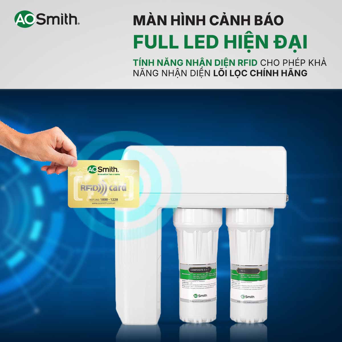 A. O. Smith R400E được tích hợp công nghệ nhận dạng lõi lọc chính hãng bằng RFID. Mỗi lõi lọc đều được gắn chip nhận dạng tần số vô tuyến, giúp máy tự động kiểm tra và phát tín hiệu cảnh báo nếu phát hiện lõi lọc không chính hãng. Nhờ đó, người dùng có thể hoàn toàn yên tâm sử dụng, với cam kết 100% lõi lọc chính hãng, lọc sạch đúng chuẩn.