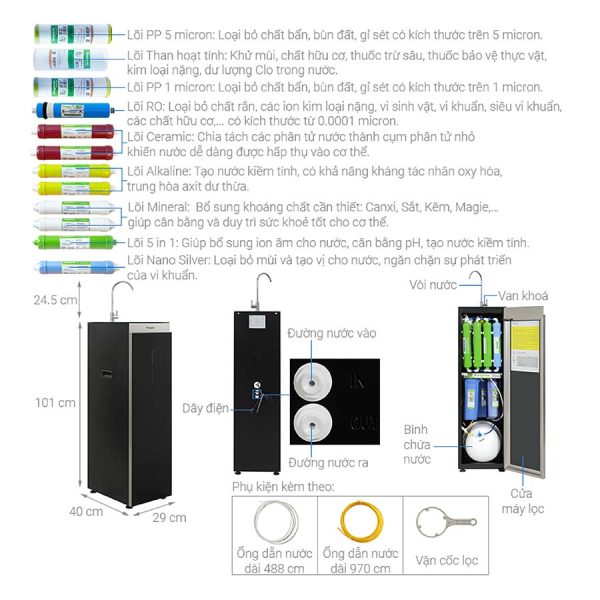 • Lõi Nano Silver (Sản xuất tại Việt Nam): Loại bỏ mùi, tạo vị tươi mát, ngăn chặn sự phát triển của vi khuẩn trong nước, bảo đảm nguồn nước luôn sạch và an toàn.