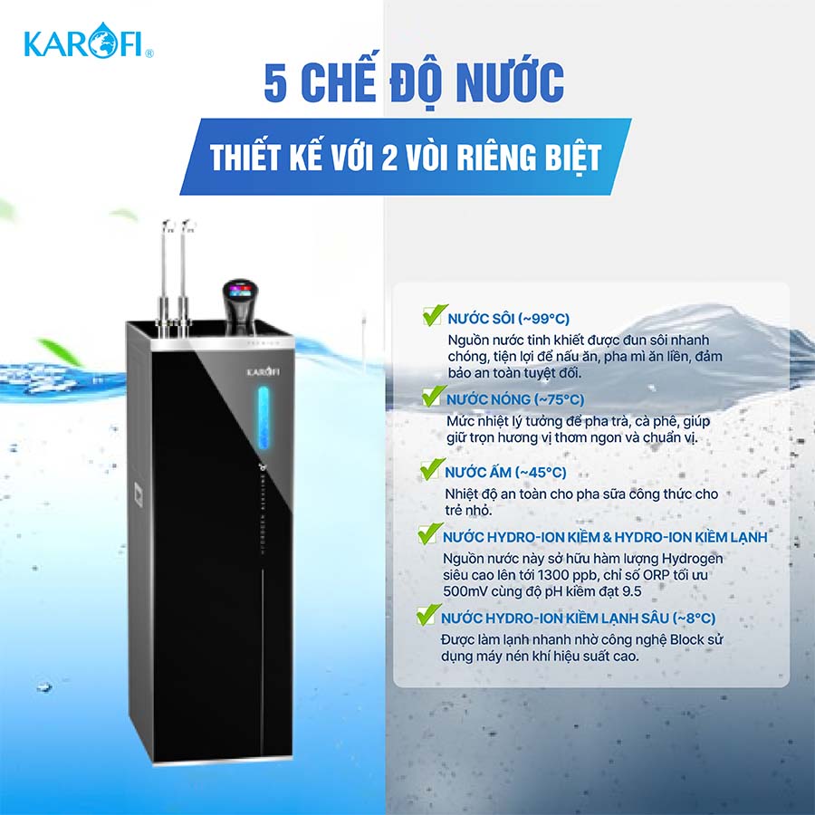 Máy lọc nước nóng lạnh Hydro-ion kiềm Karofi KAE-S88 ProMax không chỉ đơn thuần là một thiết bị lọc nước, mà còn là giải pháp chăm sóc sức khỏe và tiện nghi toàn diện cho cả gia đình. Với thiết kế 2 vòi thông minh, sản phẩm mang đến 5 mức nước đa dạng, đáp ứng linh hoạt mọi nhu cầu sử dụng từ sinh hoạt hàng ngày cho đến chăm sóc sức khỏe chuyên sâu.