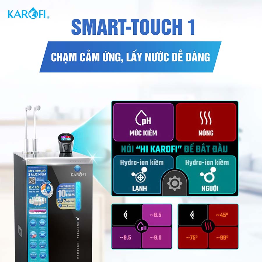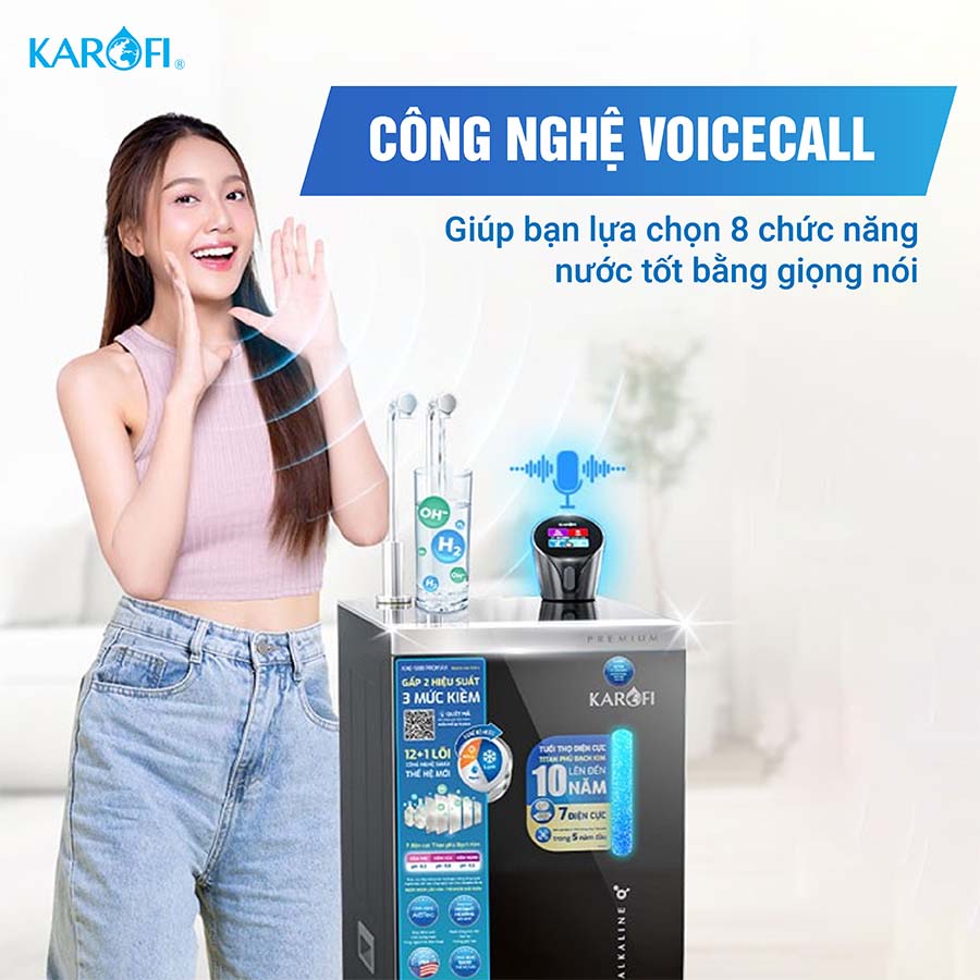 Máy lọc nước Karofi KAE-S88 ProMax mang đến trải nghiệm hoàn toàn mới với công nghệ VoiceCall hiện đại, cho phép bạn điều khiển và lấy nước chỉ bằng giọng nói. Chỉ cần bắt đầu bằng câu lệnh “Hi Karofi”, tính năng sẽ được kích hoạt ngay lập tức. Sau đó, bạn có thể thoải mái lựa chọn 8 chức năng nước tốt khác nhau, phù hợp từng nhu cầu: nước sôi (~99℃) để nấu ăn, nước nóng (~75℃) để pha trà hay cà phê, nước pha sữa (~45℃) tiện lợi cho trẻ nhỏ, nước lạnh mát sảng khoái, nước Hydrogen giàu chất chống oxy hóa, cùng nước kiềm 8 – 9 – 10 (pH 8.5 – 9.0 – 9.5) tốt cho sức khỏe. Khi muốn dừng lấy nước, bạn chỉ cần nói “Karofi” là hệ thống sẽ ngắt ngay lập tức.
