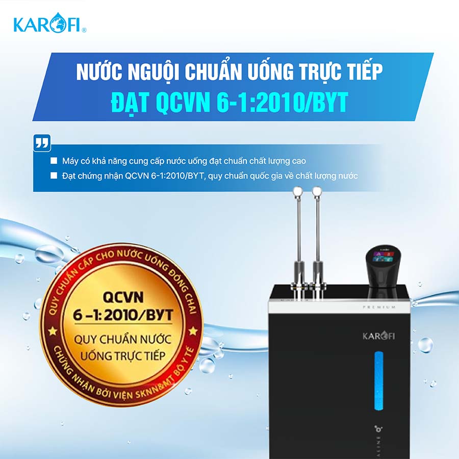 Nguồn nước sau lọc tại vòi đạt chuẩn nước uống tinh khiết đóng chai QCVN 6-1:2010/BYT tiêu chuẩn cao nhất hiện nay đối với nước uống trực tiếp. Kết quả này đã được Viện Sức khỏe nghề nghiệp & Môi trường kiểm nghiệm và chứng nhận, đảm bảo mỗi giọt nước từ KAE-S88 ProMax đều tinh khiết, an toàn và tốt cho sức khỏe người dùng.