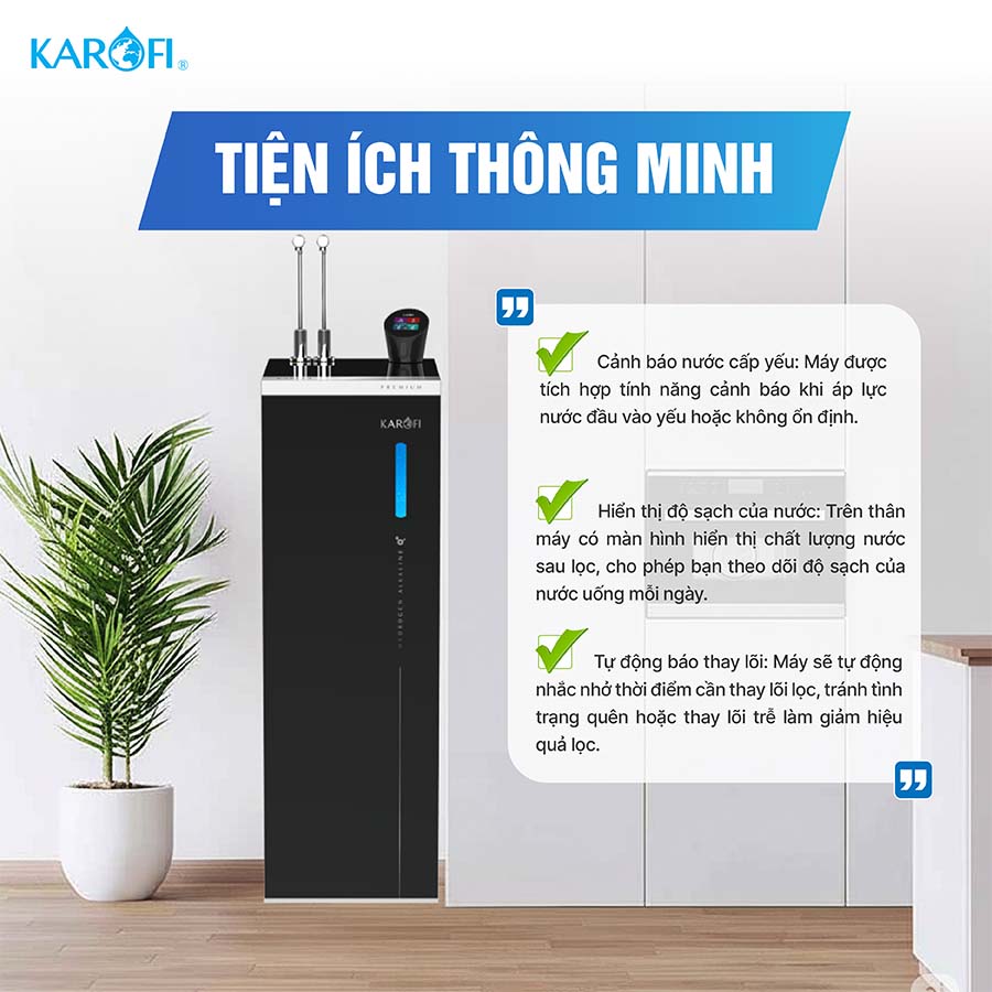 • Cảnh báo nước cấp yếu: Máy được tích hợp tính năng cảnh báo khi áp lực nước đầu vào yếu hoặc không ổn định. Điều này giúp người dùng kịp thời phát hiện và xử lý, đảm bảo máy hoạt động đúng chuẩn và nguồn nước sau lọc luôn tinh khiết.