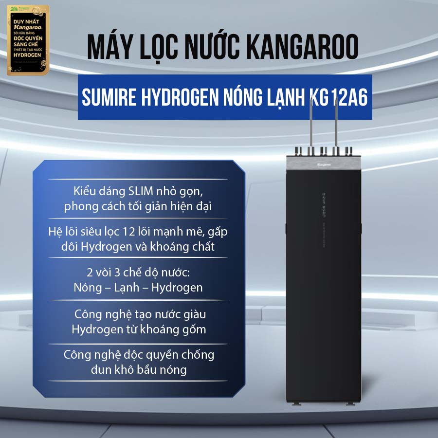Máy lọc nước nóng lạnh Hydrogen Kangaroo KG12A6 là lựa chọn hoàn hảo cho gia đình hiện đại, kết hợp giữa thiết kế sang trọng và công nghệ lọc nước tiên tiến. Không chỉ cung cấp nước tinh khiết, an toàn, sản phẩm còn tạo ra nước Hydrogen giàu khoáng chất và chất điện giải, mang lại lợi ích sức khỏe vượt trội. Với nhiều tính năng thông minh, công suất lớn và 3 chế độ nước tiện dụng, Kangaroo KG12A6 đáp ứng tối đa nhu cầu sử dụng nước uống hàng ngày của mọi thành viên trong gia đình.