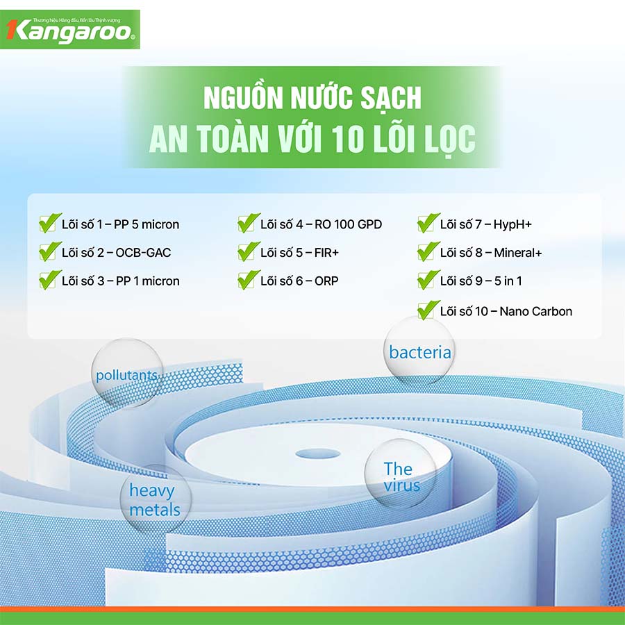 Với hệ thống 10 cấp lọc chuyên sâu, Kangaroo KG10A15 không chỉ mang lại nước sạch tinh khiết đạt chuẩn uống trực tiếp mà còn bổ sung khoáng chất, chống oxy hóa và hỗ trợ sức khỏe toàn diện cho cả gia đình.