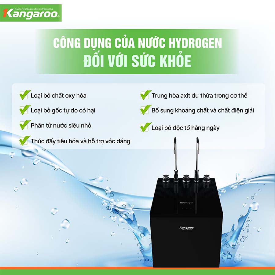 Ngoài tác dụng chống oxy hóa, nước Hydrogen do KG10A15 tạo ra còn bổ sung khoáng chất và điện giải (những ion như K⁺, Mg²⁺, Ca²⁺, Na⁺) giúp cân bằng điện giải, hỗ trợ chức năng cơ bắp, hệ tim mạch và quá trình trao đổi chất. Nhờ cấu trúc phân tử được xử lý (marketing thường gọi là “phân tử nước siêu nhỏ”), nước dễ thẩm thấu hơn tức là hỗ trợ bù nước nhanh, cải thiện hiệu quả thanh lọc và hấp thu dinh dưỡng trong sinh hoạt hàng ngày.