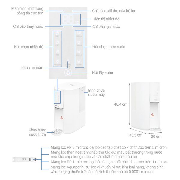 • Màng lọc Aquaporin RO: Lọc sạch vi sinh vật, kim loại nặng, dư lượng thuốc trừ sâu và các tạp chất siêu nhỏ, đảm bảo độ tinh khiết tối đa cho nước sau lọc.